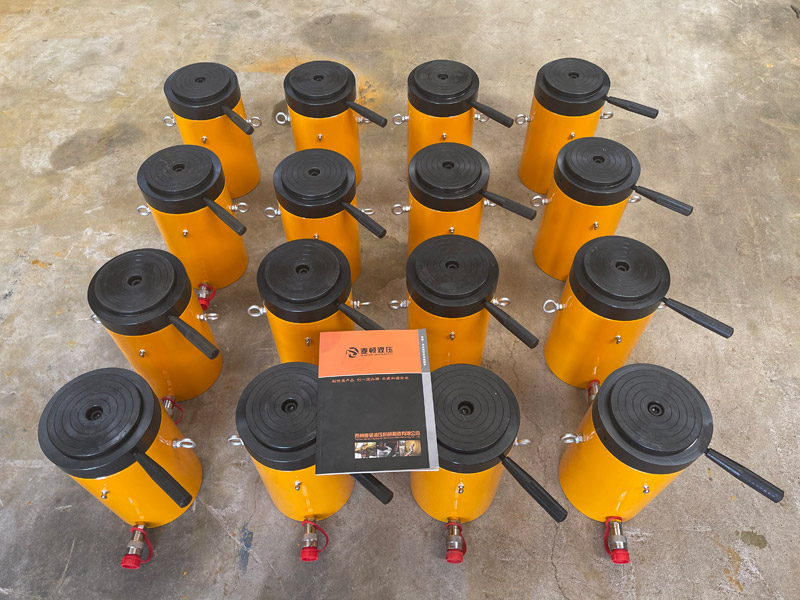 d)新的或久置的油壓千斤頂,因油缸內存有較多空氣,開始使用時,活塞桿可能出現微小的突跳現象,可將油壓千斤頂空載往復運動2-3次,以排除腔內的空氣。長期閑置的千斤頂,由于密封件長期不工作而造成密封件的硬化,從而影響油壓千斤頂的使用壽命,所以油壓千斤頂在不用時,每月要將油壓千斤頂空載往復運動2-3次。